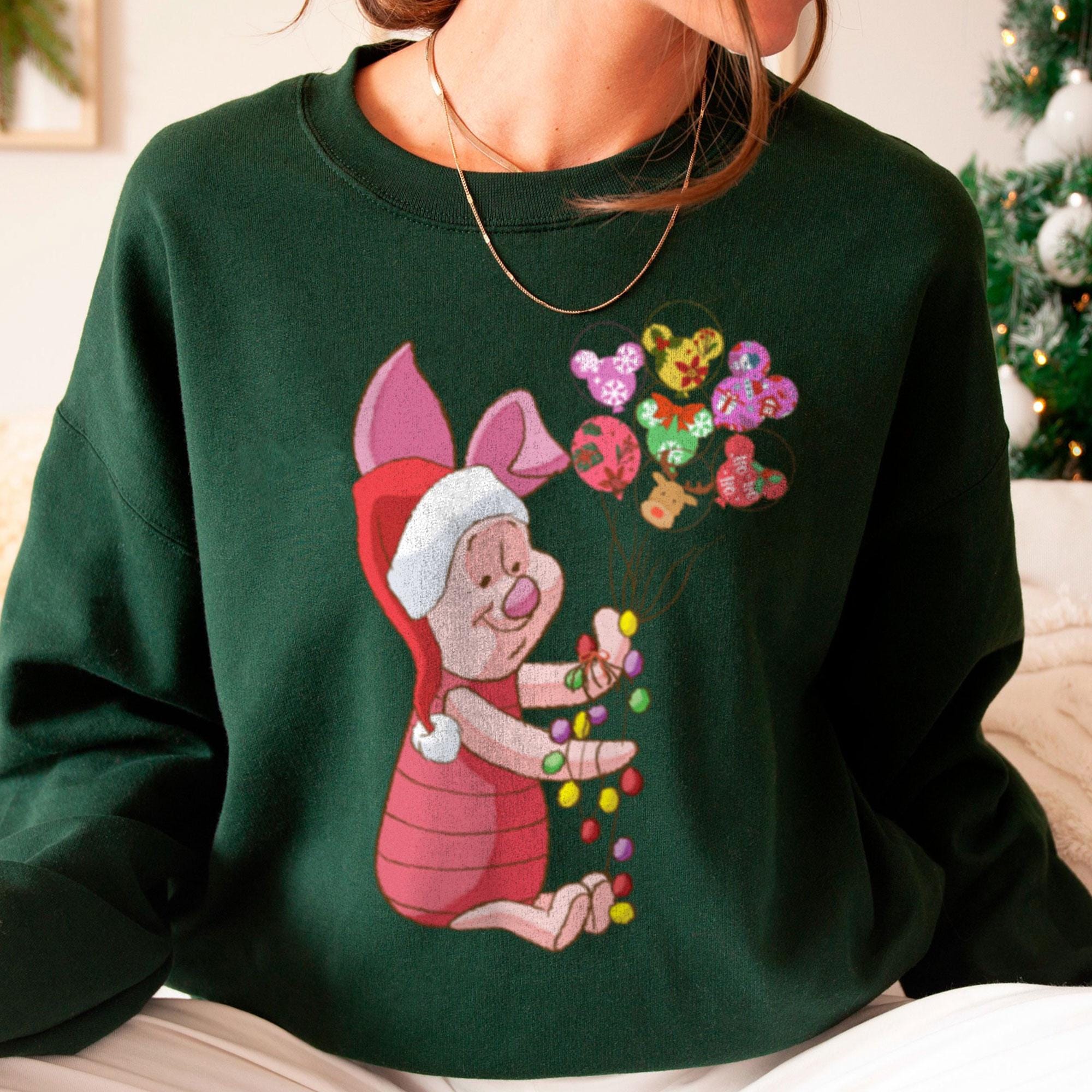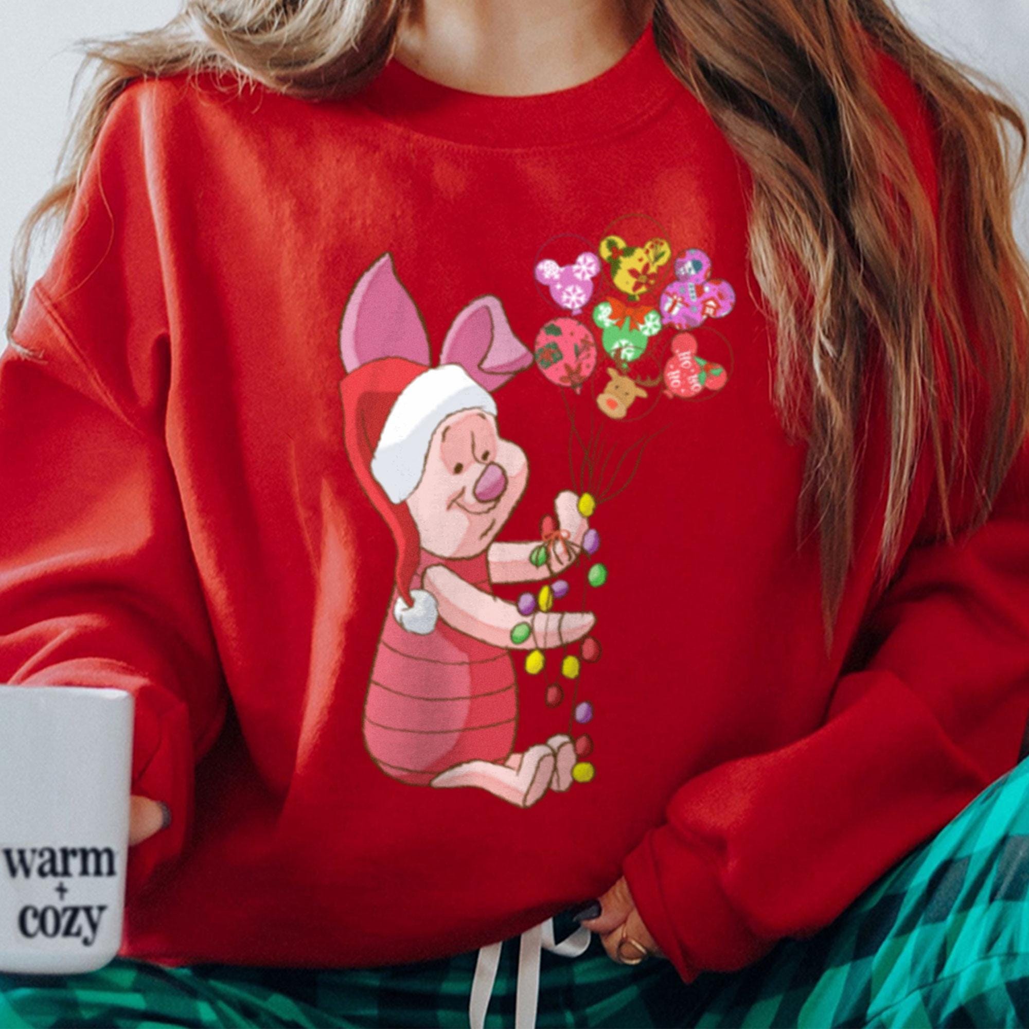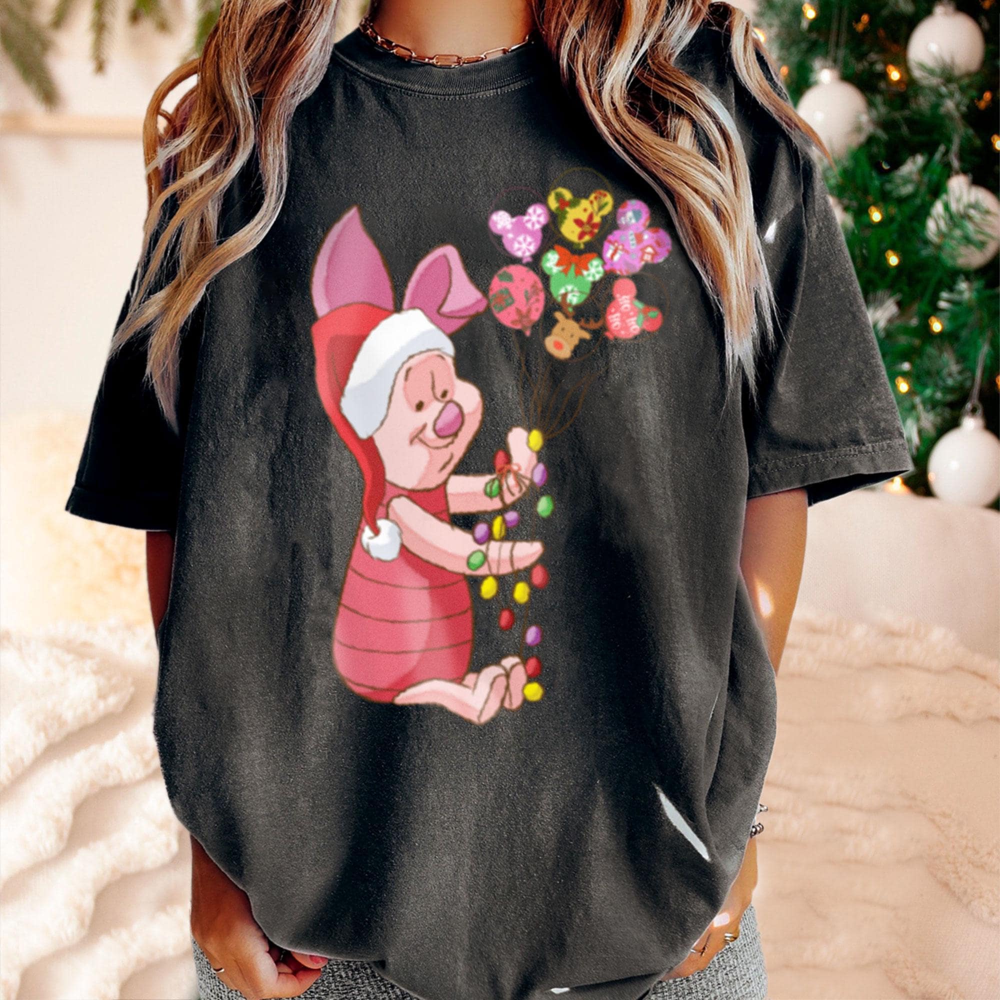 Santa Piglet And Mickey Balloon Xmas Light A Very Merry Party X-mas Retro Comfort Color T-Shirt, Disneyland Vacation Trip Family Gift 2024