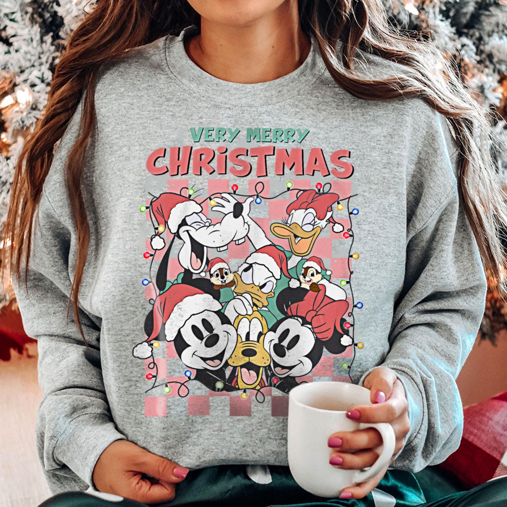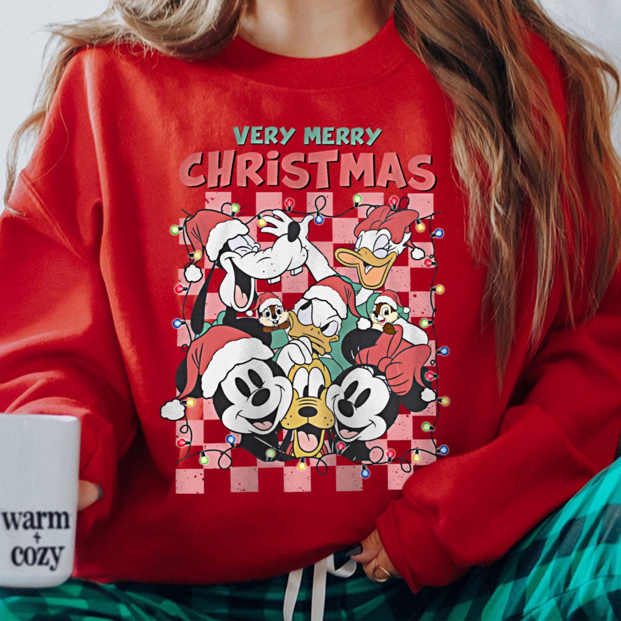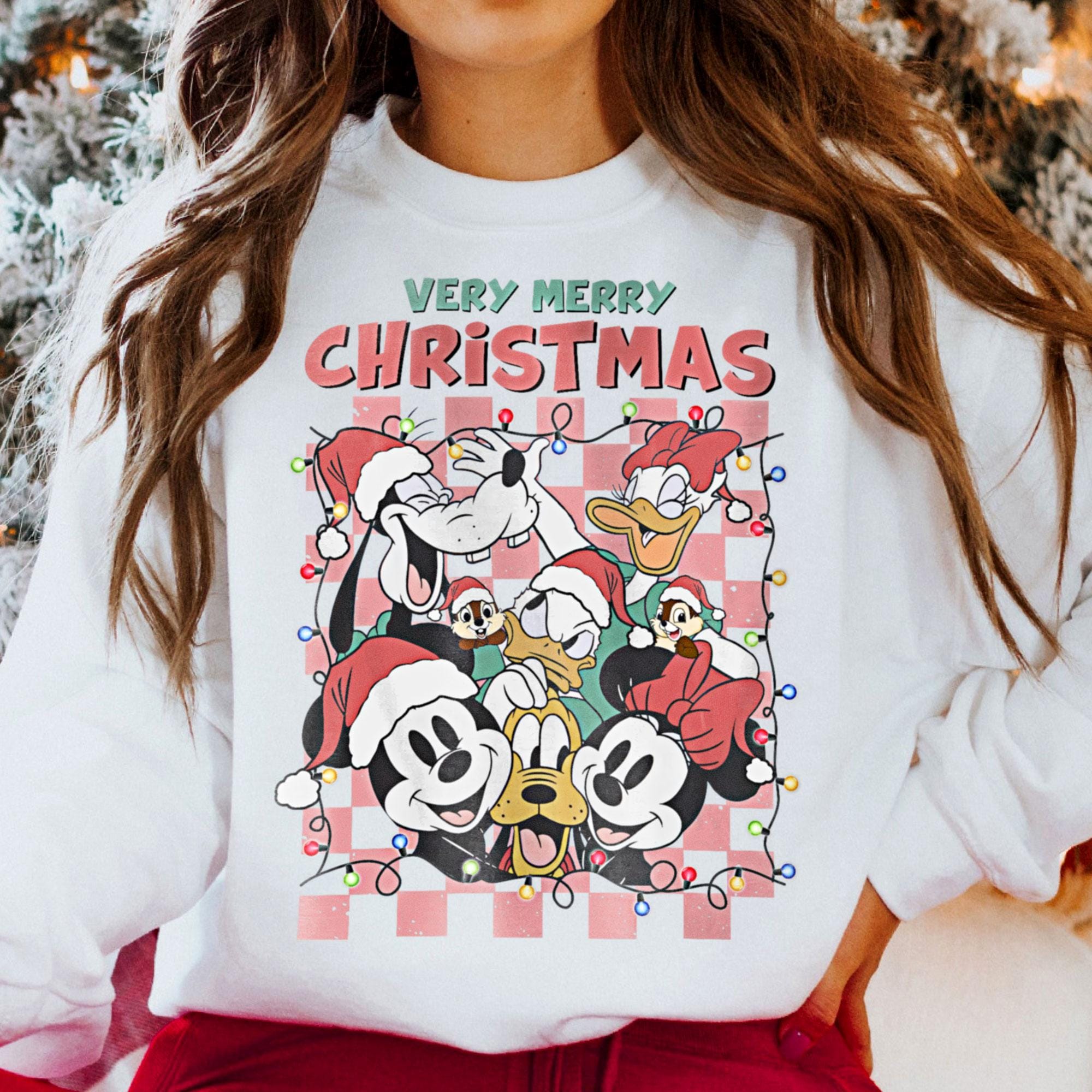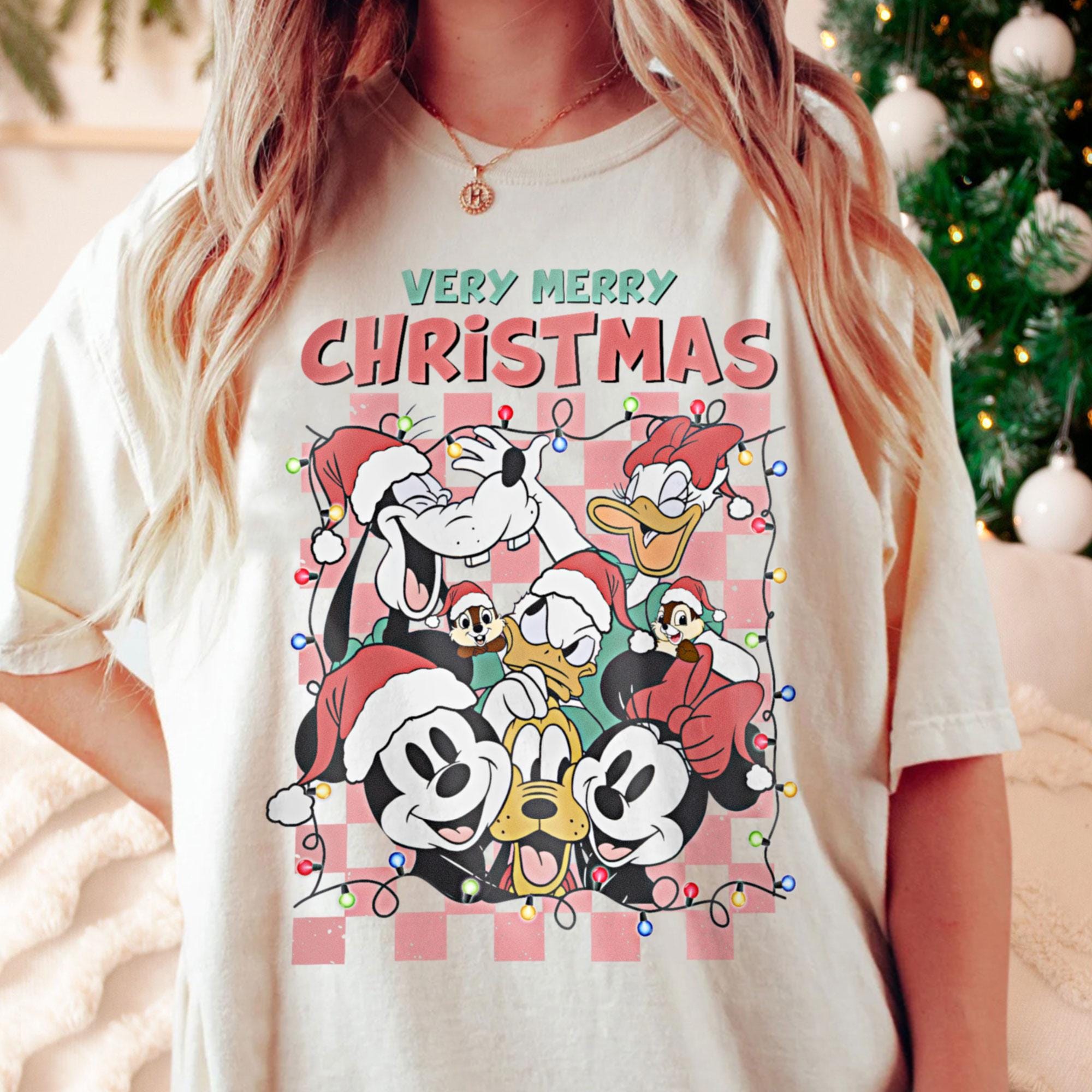 Pink Very Merry Christmas Mickey Daisy Pluto Goofy Donald Duck Friends Shirt, X-mas Retro T-Shirt, Disneyland Vacation Trip Family Gift 2024