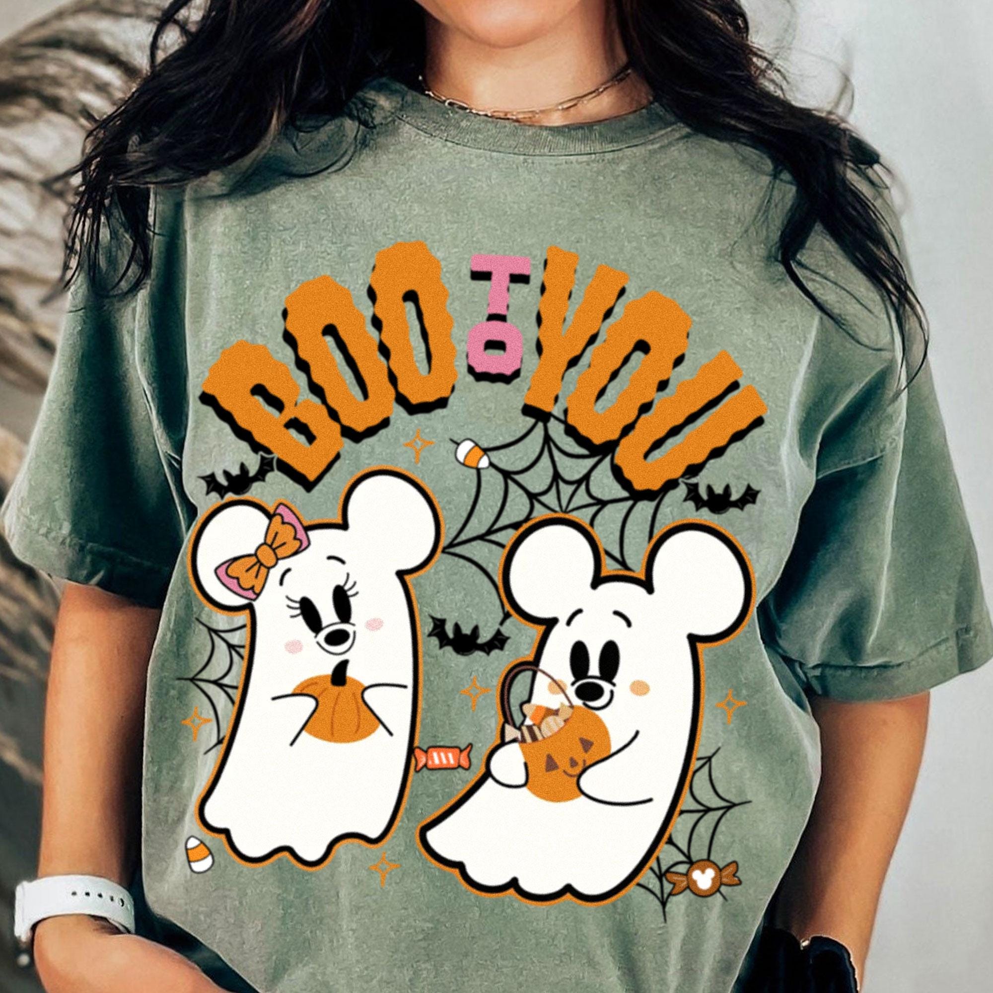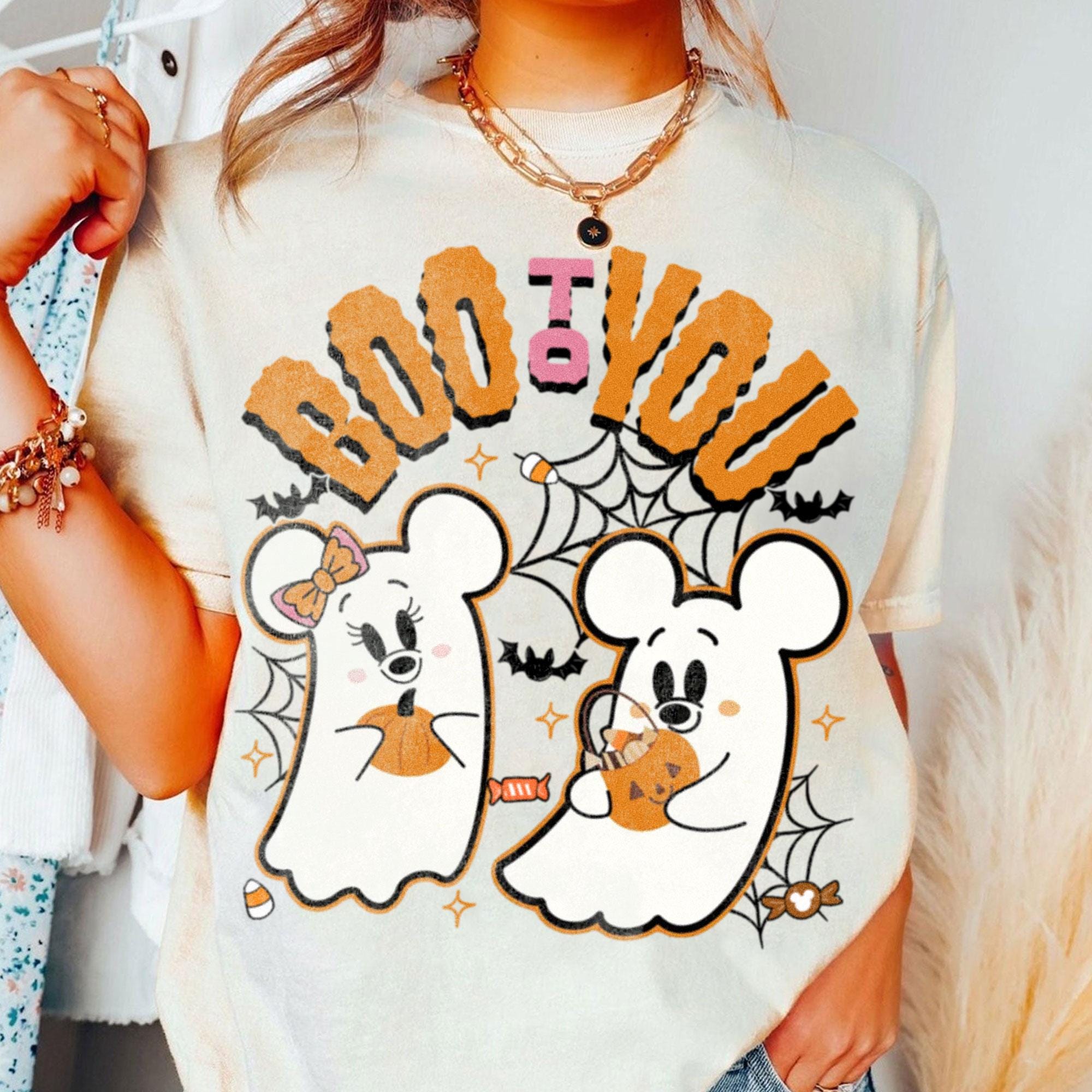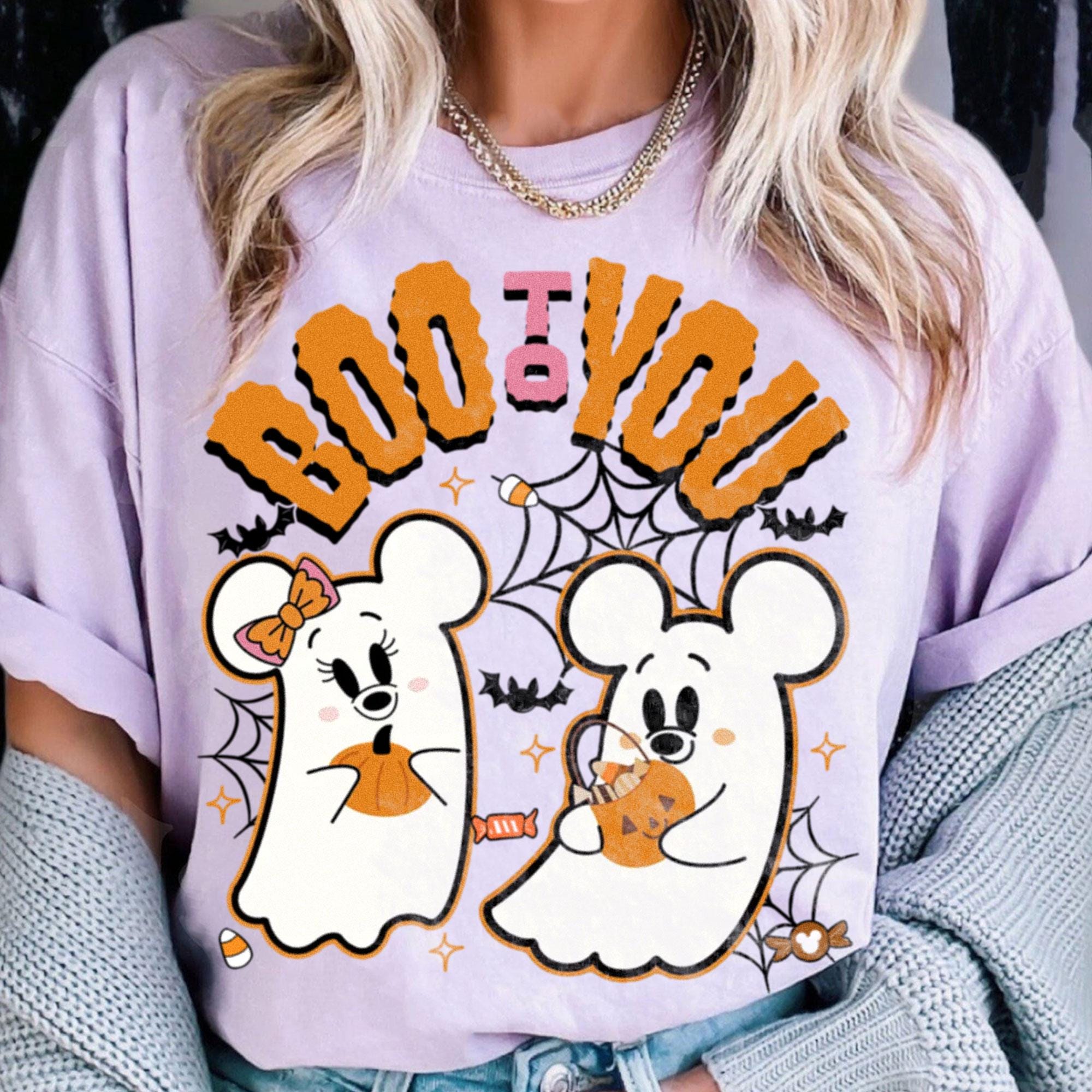Boo To You Mickey Minnie Pink Coquette Bow Ghost Comfort Color Shirt, Spooky Season Shirt, Fall Season Trip Shirt, Halloween Party Tee